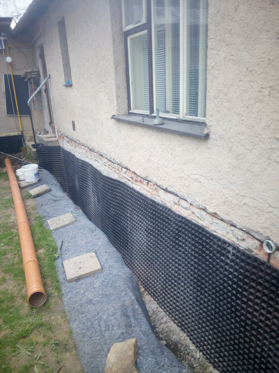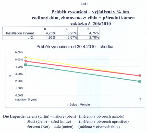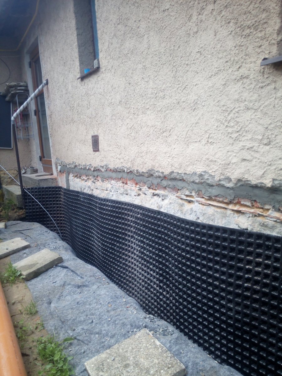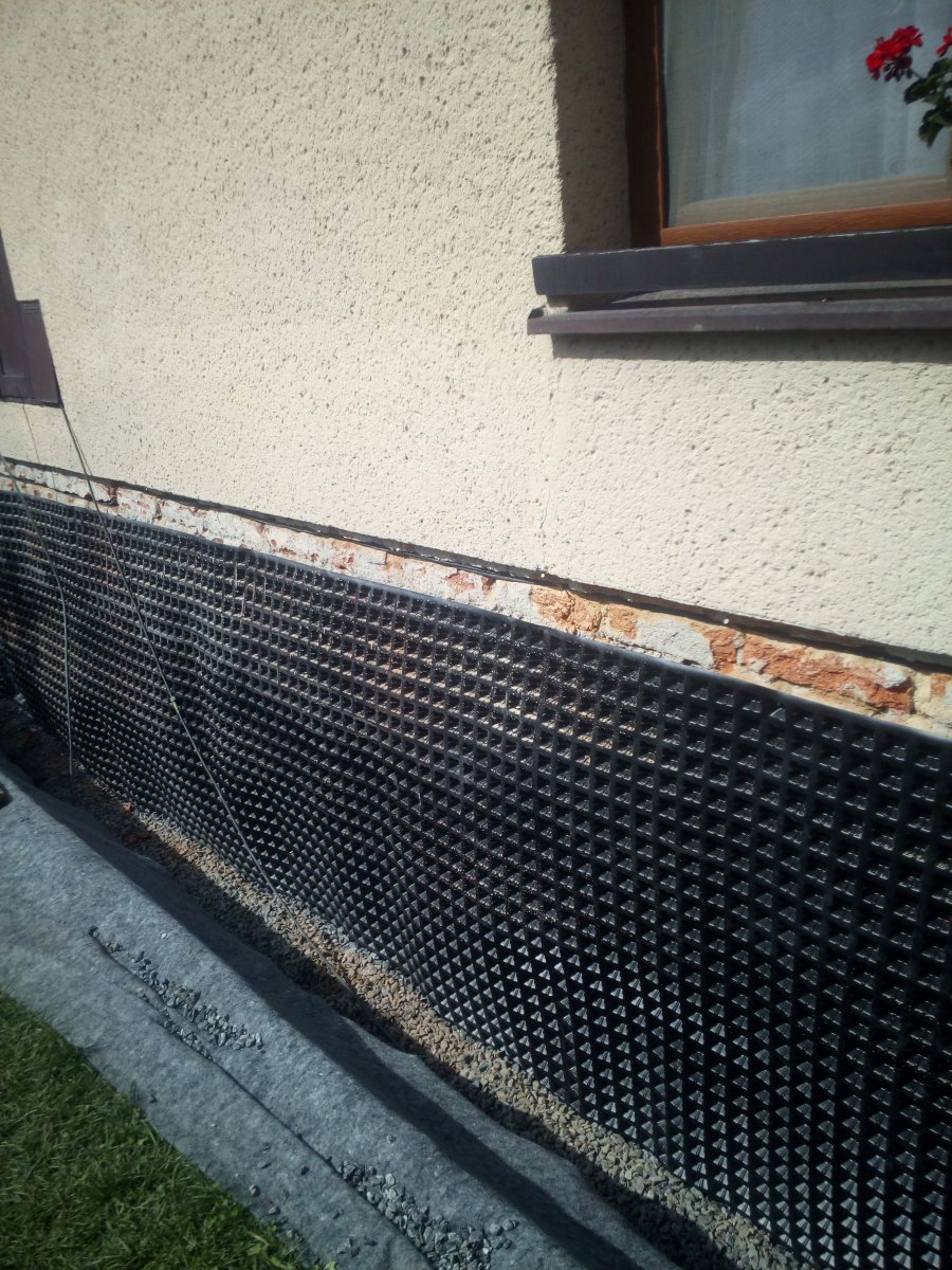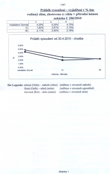 - Technologie: Pro vysušení zdiva spodní stavby rodinného domu instalována aktivní drátová elektroosmóza. Prvky osmózy zabudovány do vlhkého zdiva a podzákladí. Mezi anodou a katodou je vytvářeno mírné elektrické pole, které pomáhá vysoušet zdivo.
