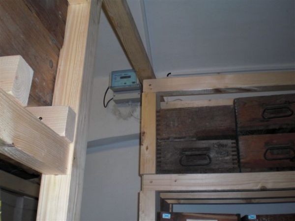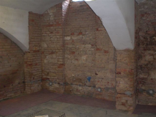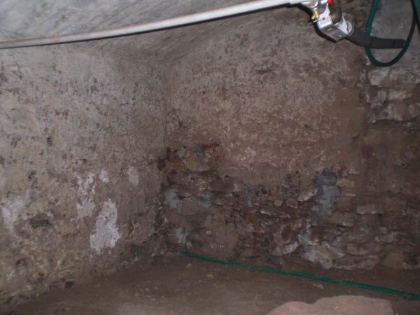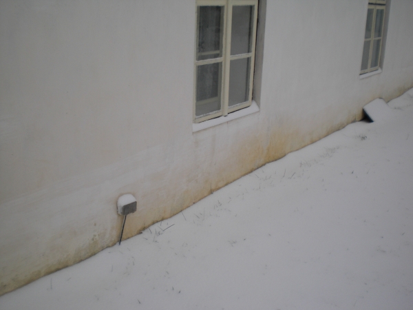 - Technologie: Jako první fázi sanace vlhkosti suterénu rozsáhlejšího objektu byla instalována aktivní drátová elektroosmóza s elektrodami ve vlhkém zdivu a v podzákladí. V druhá fázi bude v budoucnu nutné provést výměnu vlhkostí poškozených omítek.