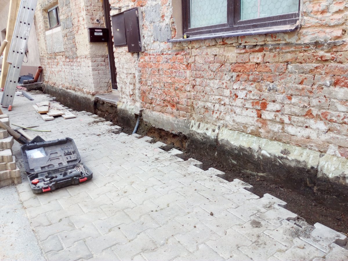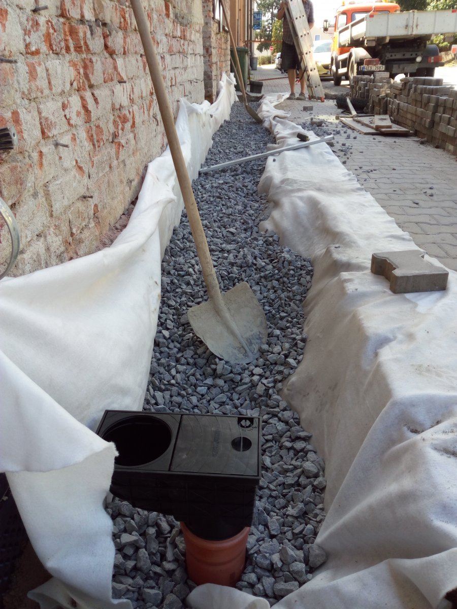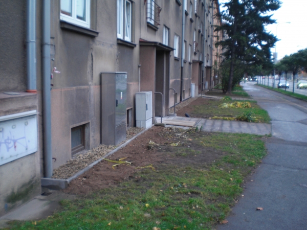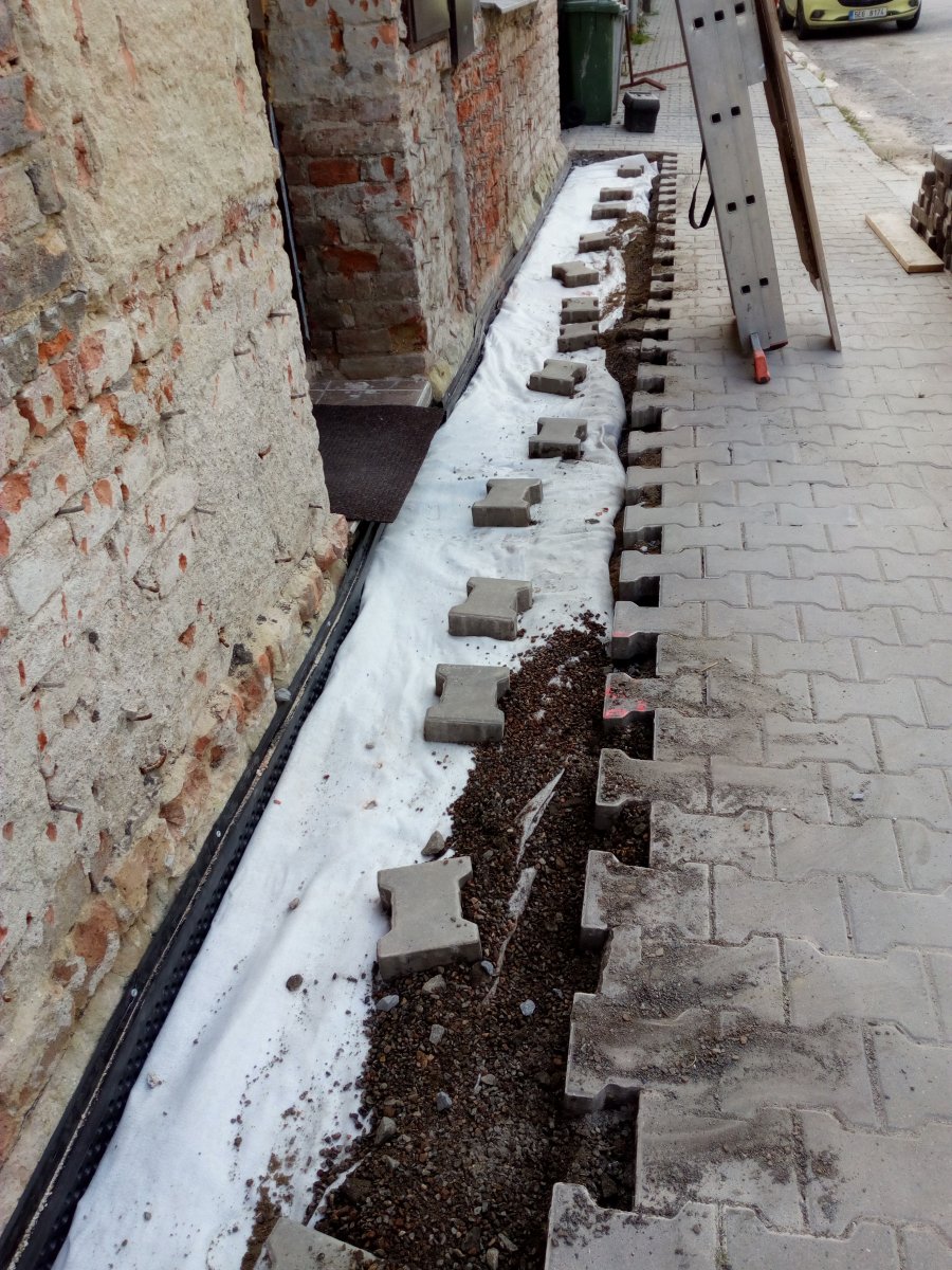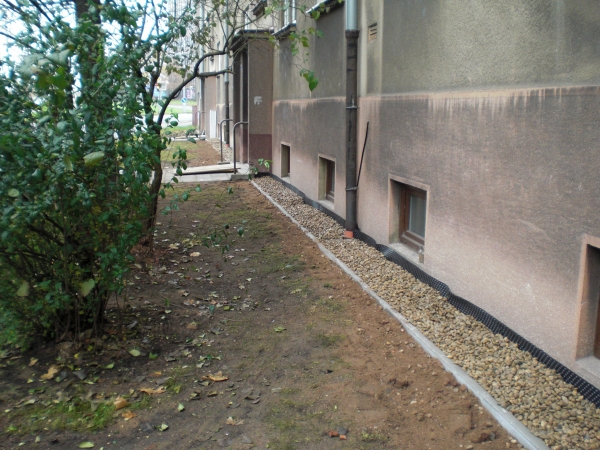 - Technologie: Provedení odkopání obvodového zdiva řadového bytového domu. Dále provedení nové svislé izolace na očištěné obvodové zdivo pomocí modifikovaných asfaltových pásů. Na dno výkopu umístěn drenážní systém pro odvod srážkových vod. Při zpětném zásypu vytvořen n