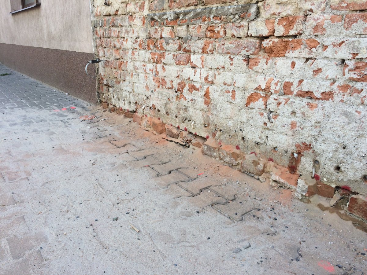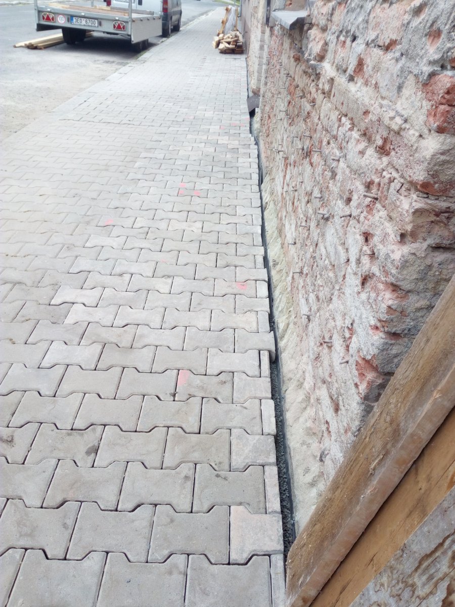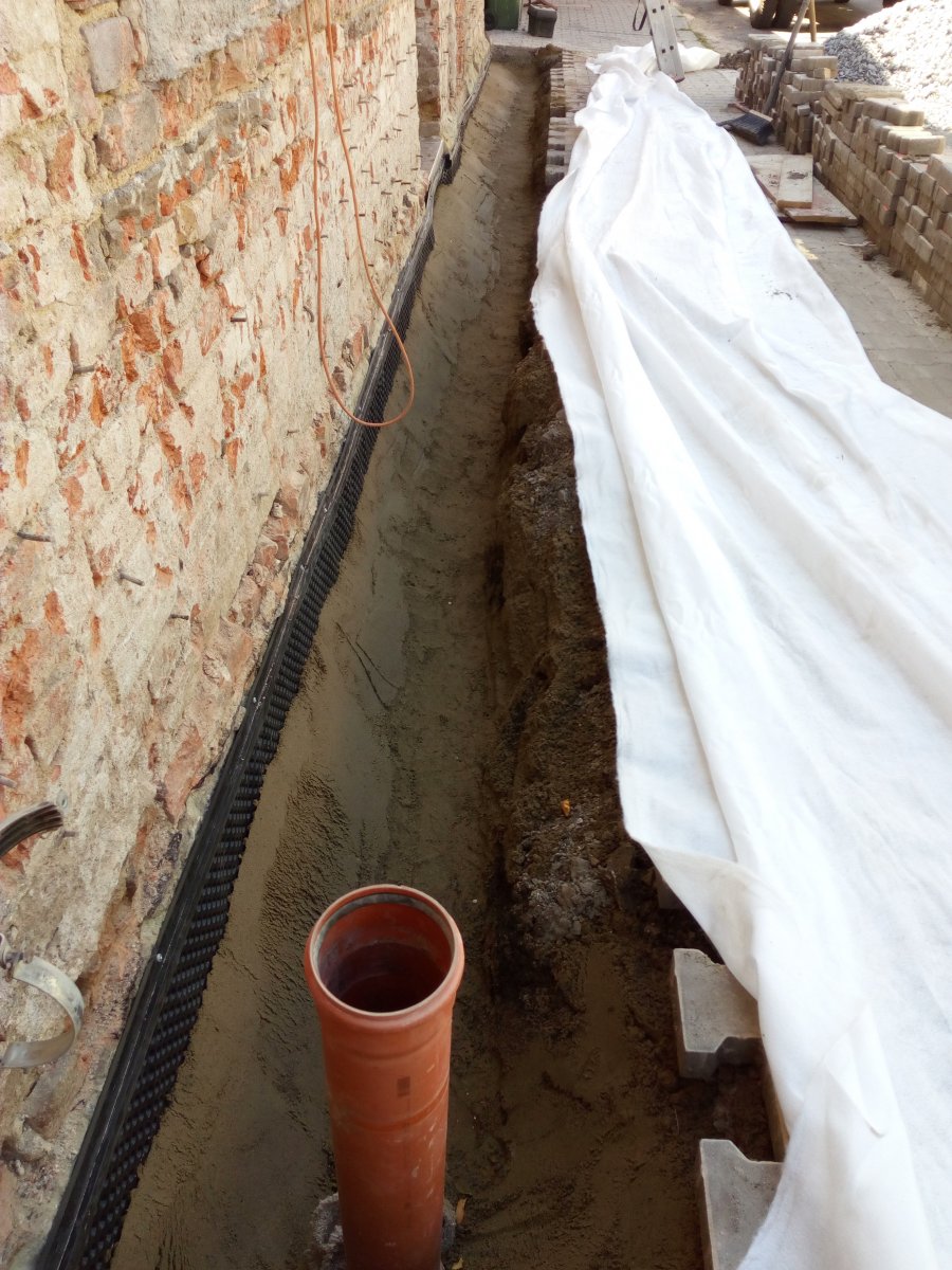 - Technologie: Provedení odkopání obvodového zdiva řadového bytového domu. Dále provedení nové svislé izolace na očištěné obvodové zdivo pomocí modifikovaných asfaltových pásů. Na dno výkopu umístěn drenážní systém pro odvod srážkových vod. Při zpětném zásypu vytvořen n
