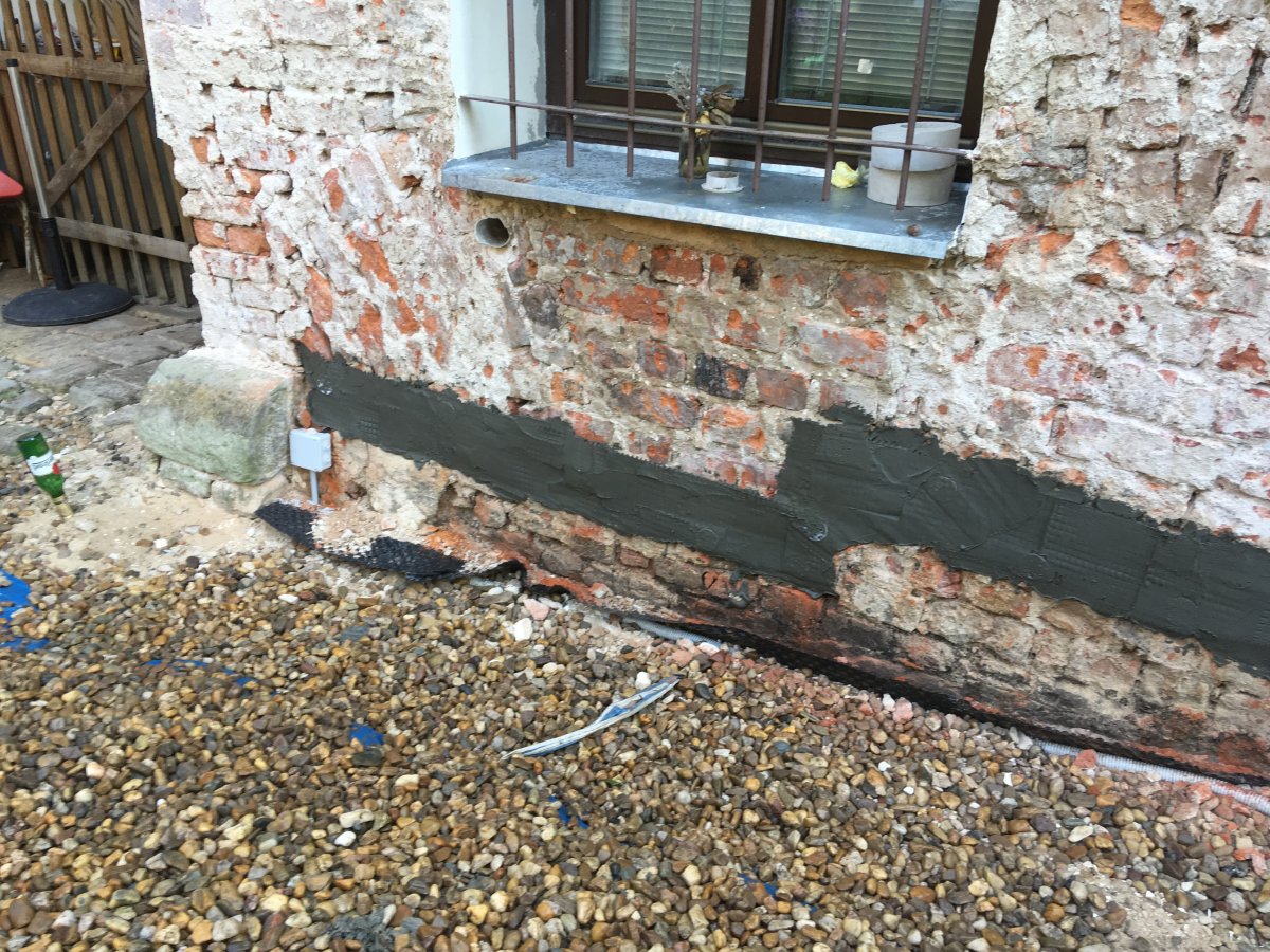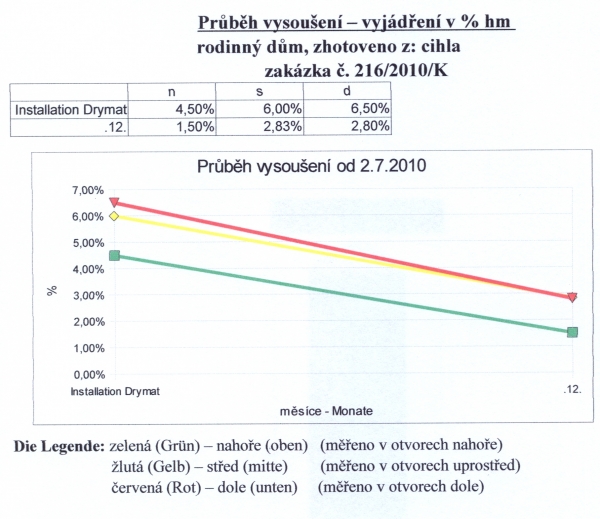 - Technologie: Instalace silnější jednotky bezdrátové elektroosmózy v suterénu rodinného domu. Bezdrátová elektroosmóza obecně generuje pro lidské tělo neškodné elektromagnetické pulsy, díky kterým dochází o obrácení polarity molekul vody ve zdivu a k jejich přesunu mim