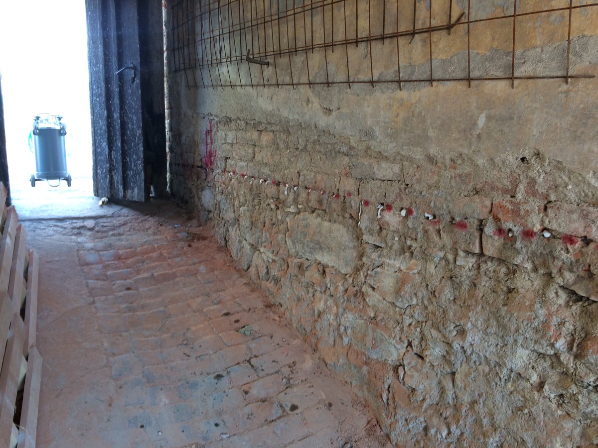 - Technologie: Majitel si nepřál provést razantní sanaci mechanickým podřezáním zdiva. Proto jsme mu jako vhodné řešení pro potlačení vzlínající vlhkosti a postupné odvlhčení zdiva doporučili metodu bezdrátové elektroosmózy. Zdivo postupně vyschlo na hodnoty normové.