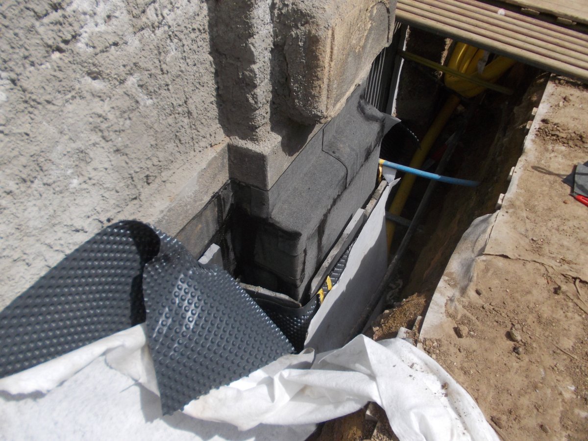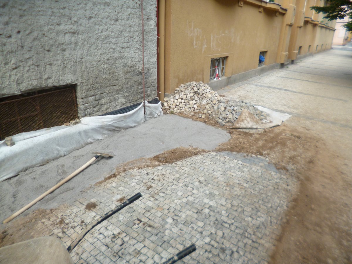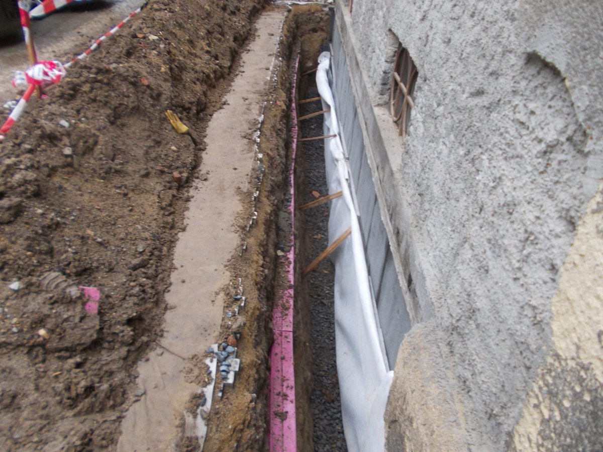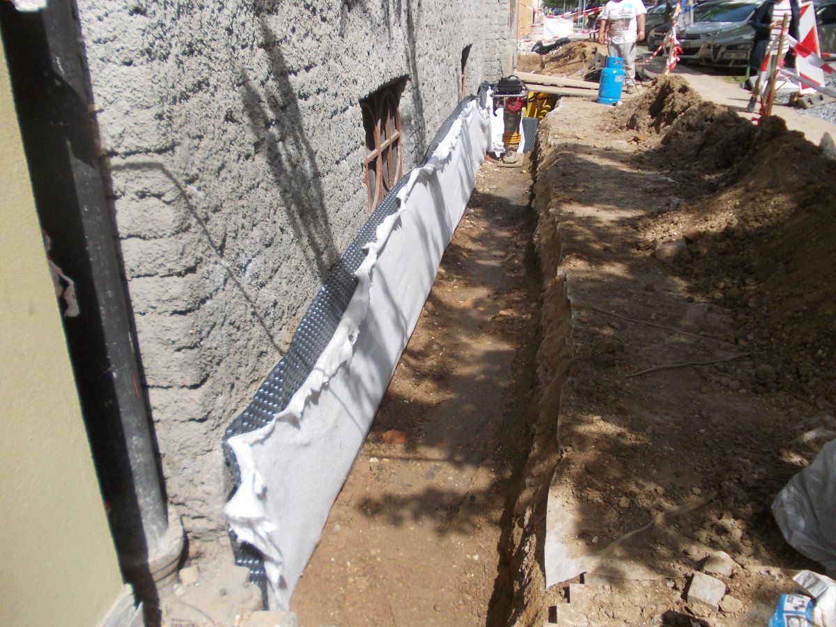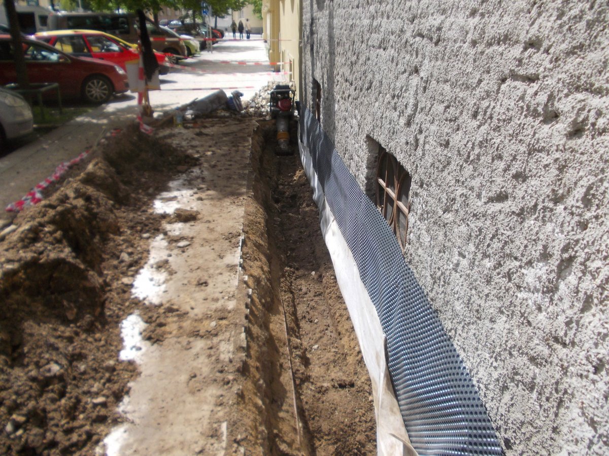 - Technologie: Provedení odkopu čelního suterénního zdiva řadového bytového domu stojícího mezi dvěma dalšími okolními bytovými domy. Provedení očištění zdiva, příprava podkladu, nové svislé izolace asfaltovými pásy, zateplení a ochrana nopovou folií.