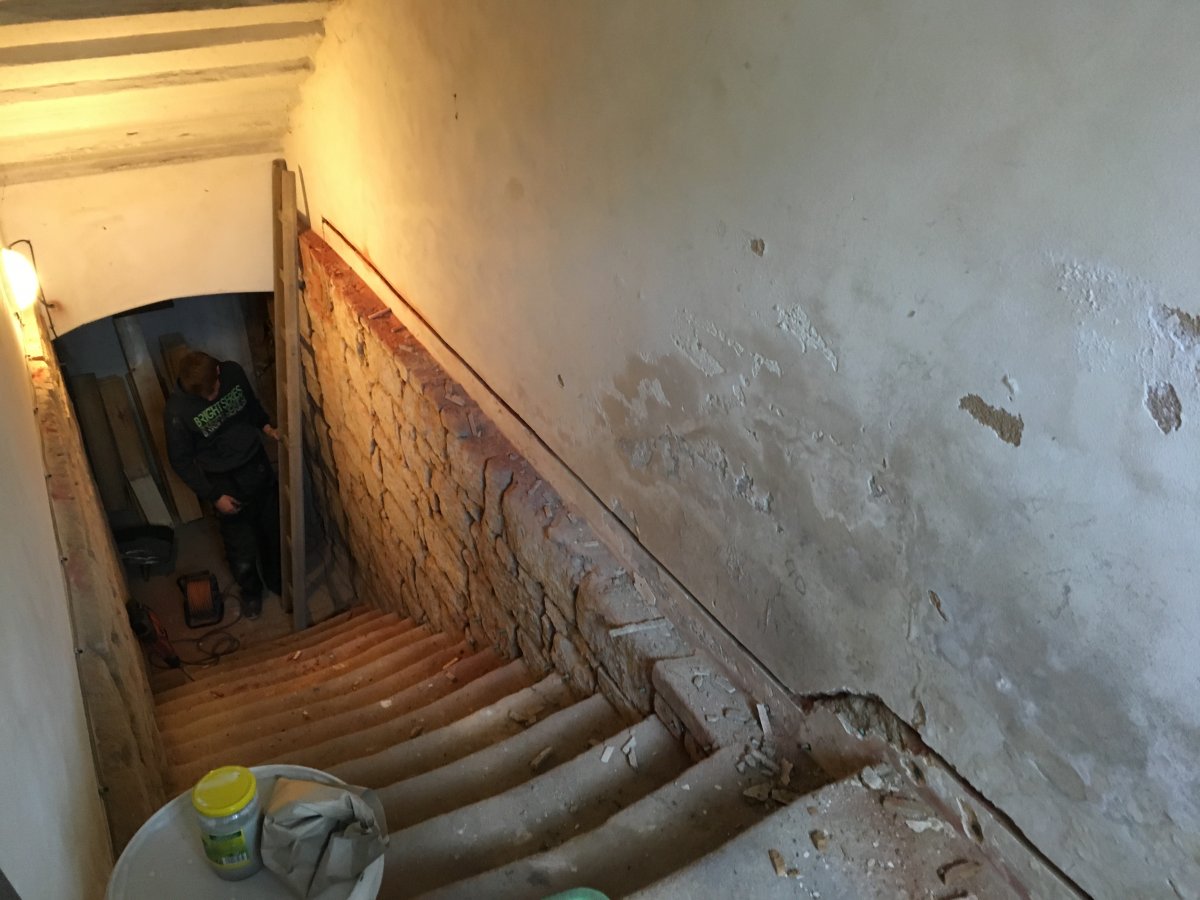 - Technologie: Provedení odkopu obvodové zdiva suterénu bytového domu, dále provedení nové svislé hydroizolace modifikovanými asfaltovými pásy, provedeno zateplení, na dno výkopu položena drenáž pro odvod srážkových vod. Nové povrchové úpravy a okapové chodníky kolem do