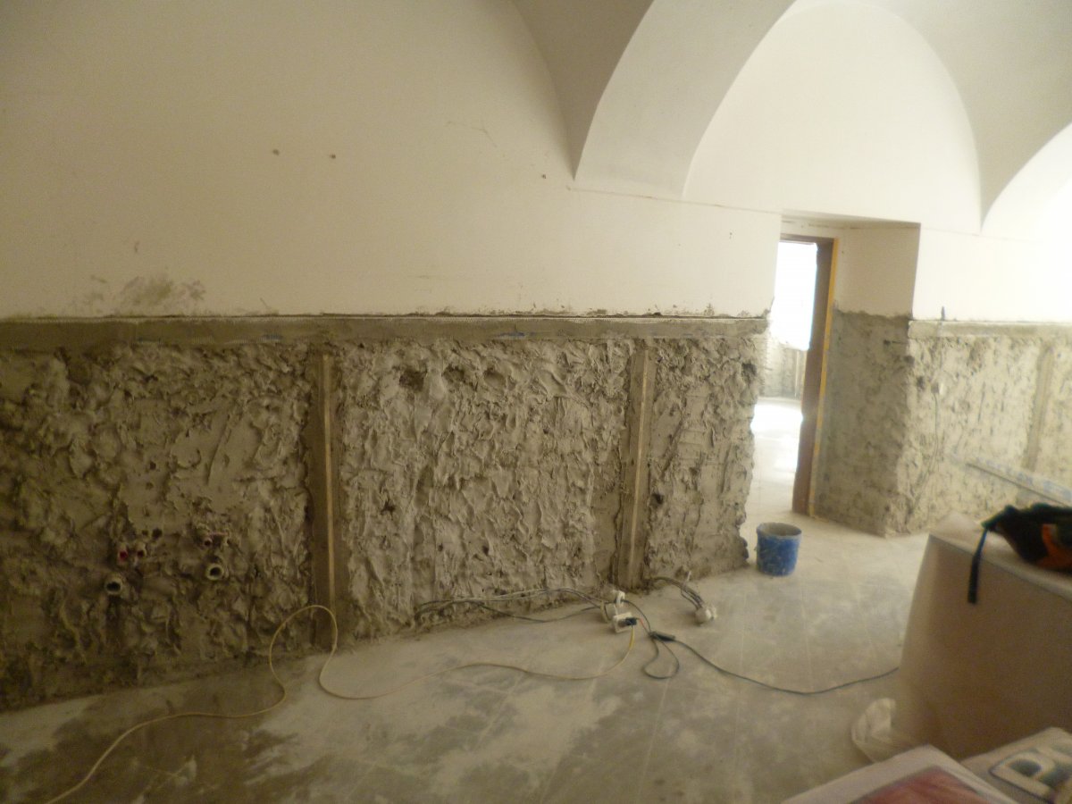 - Technologie: Pro komplexní sanaci vlhkého zdiva památkově chráněného objektu byla zvolena metoda aktivní drátové elektroosmózy. Prvky osmózy byly pevně zabudovány do zdiva. Následně na oklepané povrchy zdiva aplikovány vápenné trassové omítky.