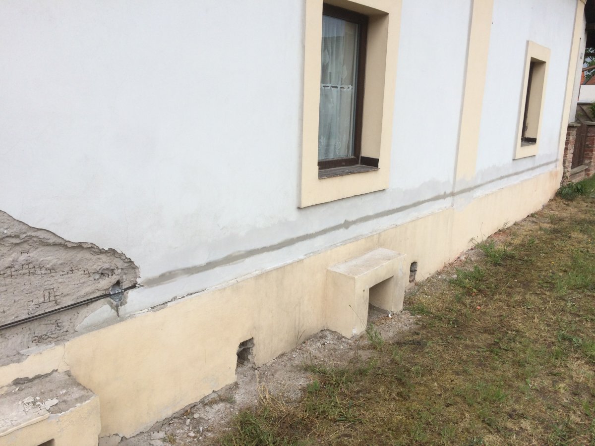 - Technologie: Injektáž zdiva provedena pro doplnění již dožívajících původních hydroizolací domu. Po svém provedení dochází po aplikaci injektážního prostředku k trvalé hydrofobizaci zdiva, která brání vzlínání vlhkosti nad injektážní clonu.