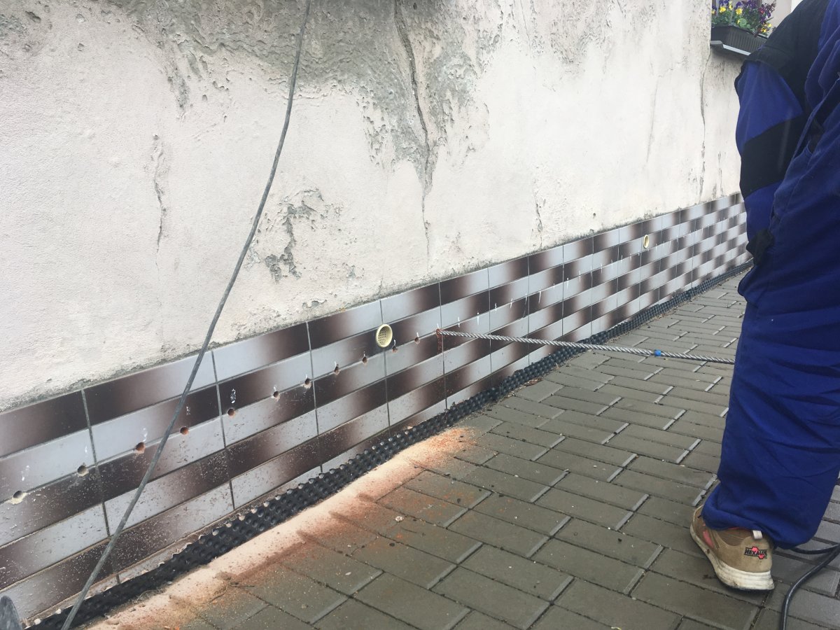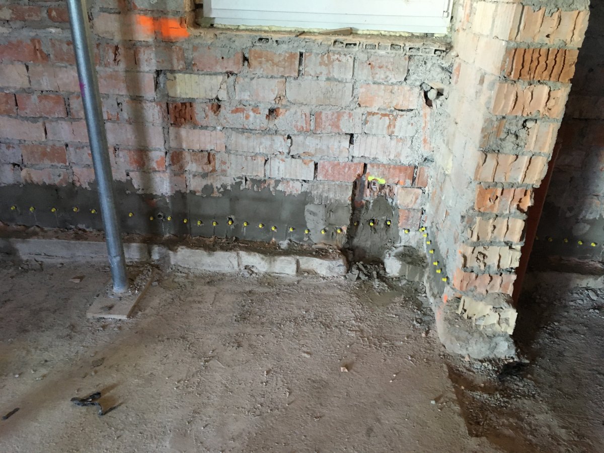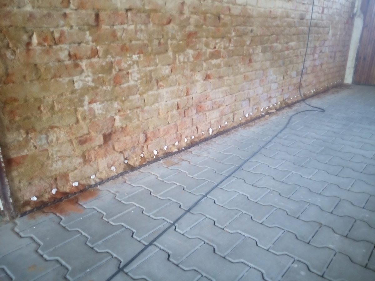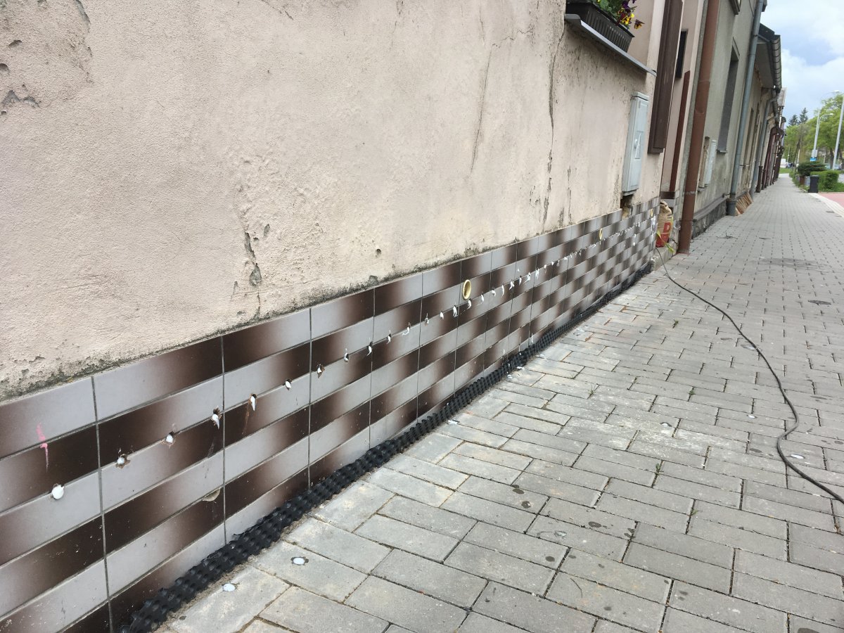 - Technologie: Pro odstranění vzlínající zemní vlhkosti a celkové pozvolné, ale trvalé odvlhčení spodní stavby rodinného domu byla zvolena technologie aktivní drátové elektroosmózy. Jednotlivé prvky osmózy instalovány do vlhkého zdiva a do podzákladí objektu.