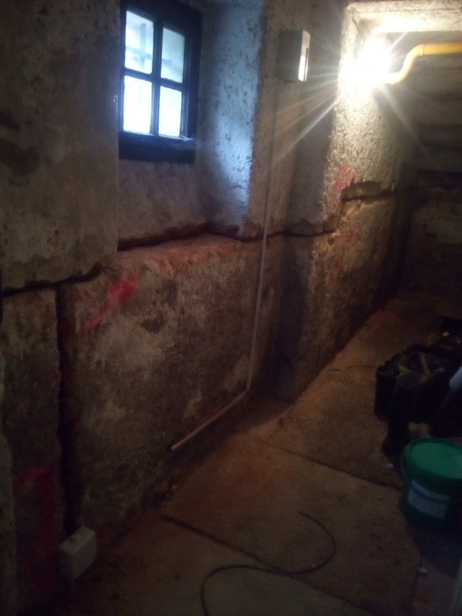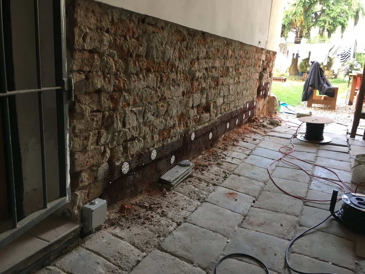- Technologie: Instalace prvků pulsní drátové elektroosmózy do obvodového zdiva suterénu bytového domu. Pulsní elektroosmóza sníží vlhkost obvodového zdiva bez nutnosti jej nákladně odkopávat zvenčí. Vnitřní zdivo řešeno chemickými injektážemi.