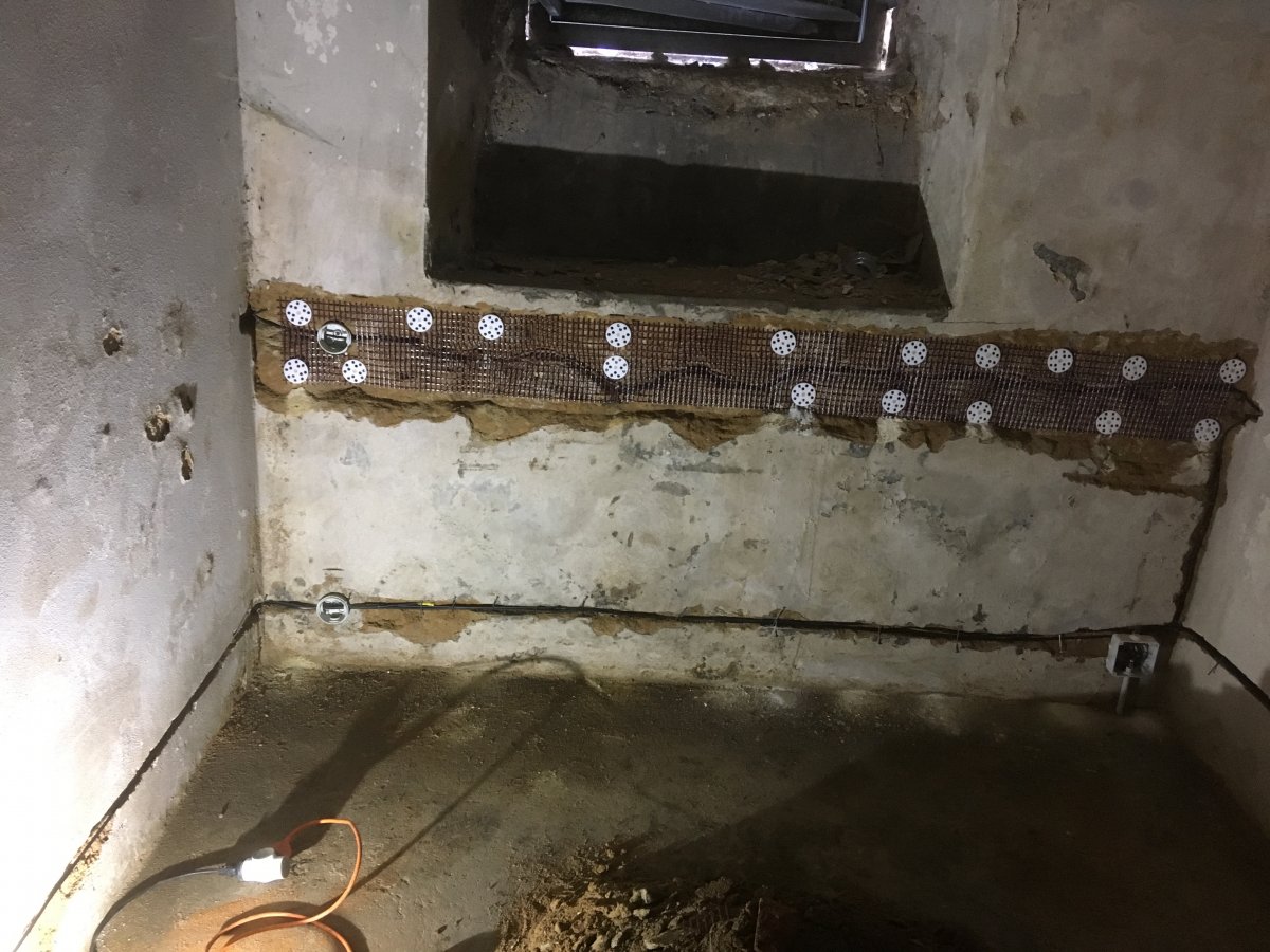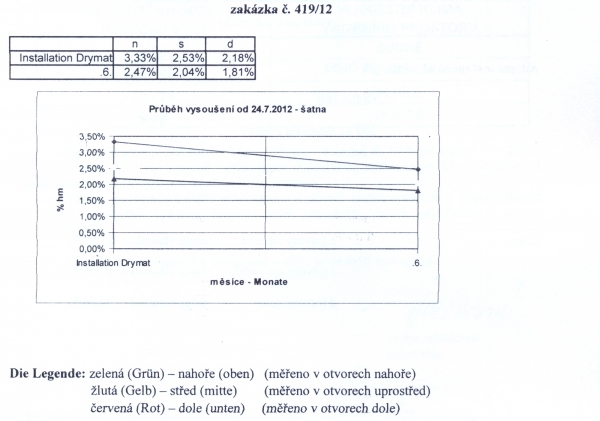 - Technologie: Provedení sanace silně zavlhlého zdiva rodinného domu a potlačení vzlínající zemní vlhkosti aktivní drátovou elektroosmózou s pevně zabudovanými elektrodami ve zdivu - anoda (vodivý kabel ve zdivu) a katody (uzemňovací tyče).
