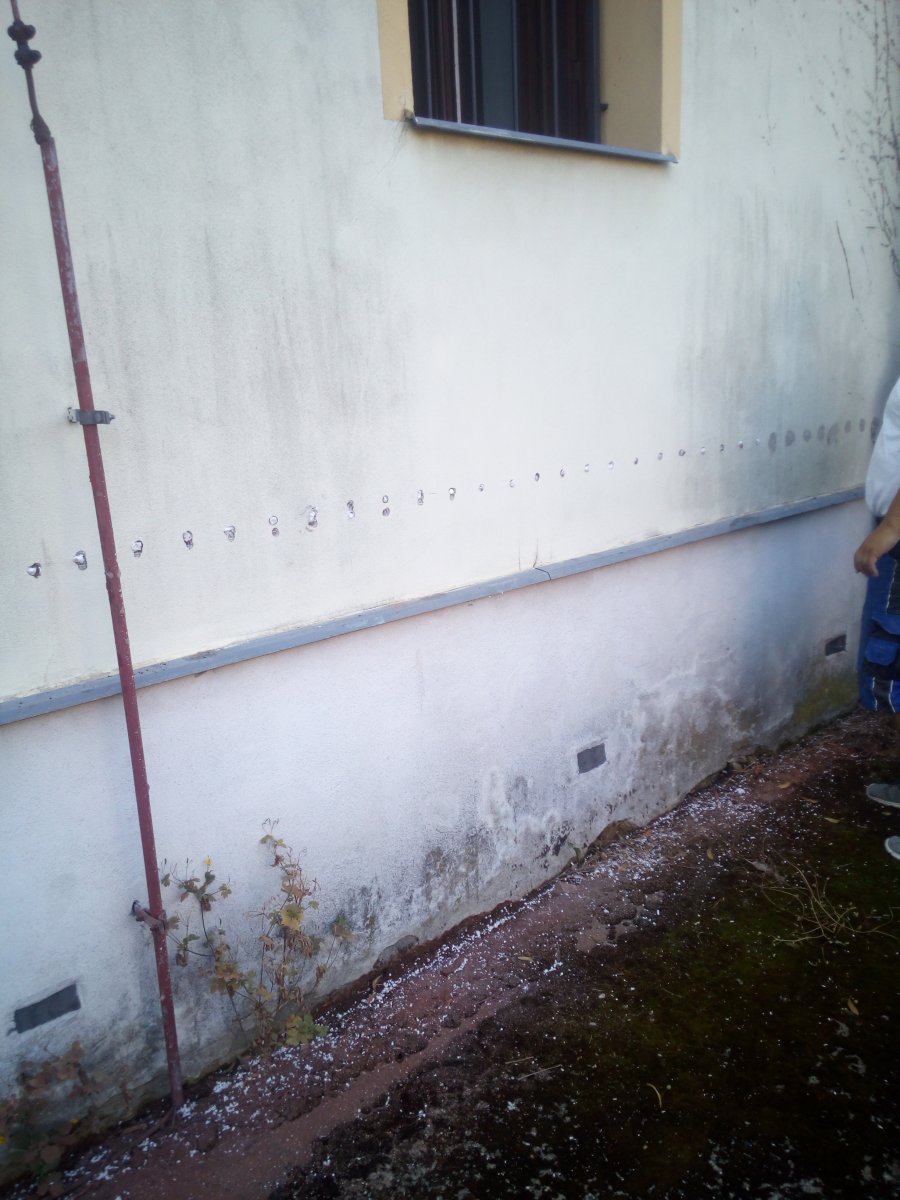 - Technologie: Instalace prvků aktivní drátové elektroosmózy do vlhkého zdiva a do podzákladí objektu pro odvlhčení obvodových stěn a dále provedení lokálních chemických clon injektážním krémem.
