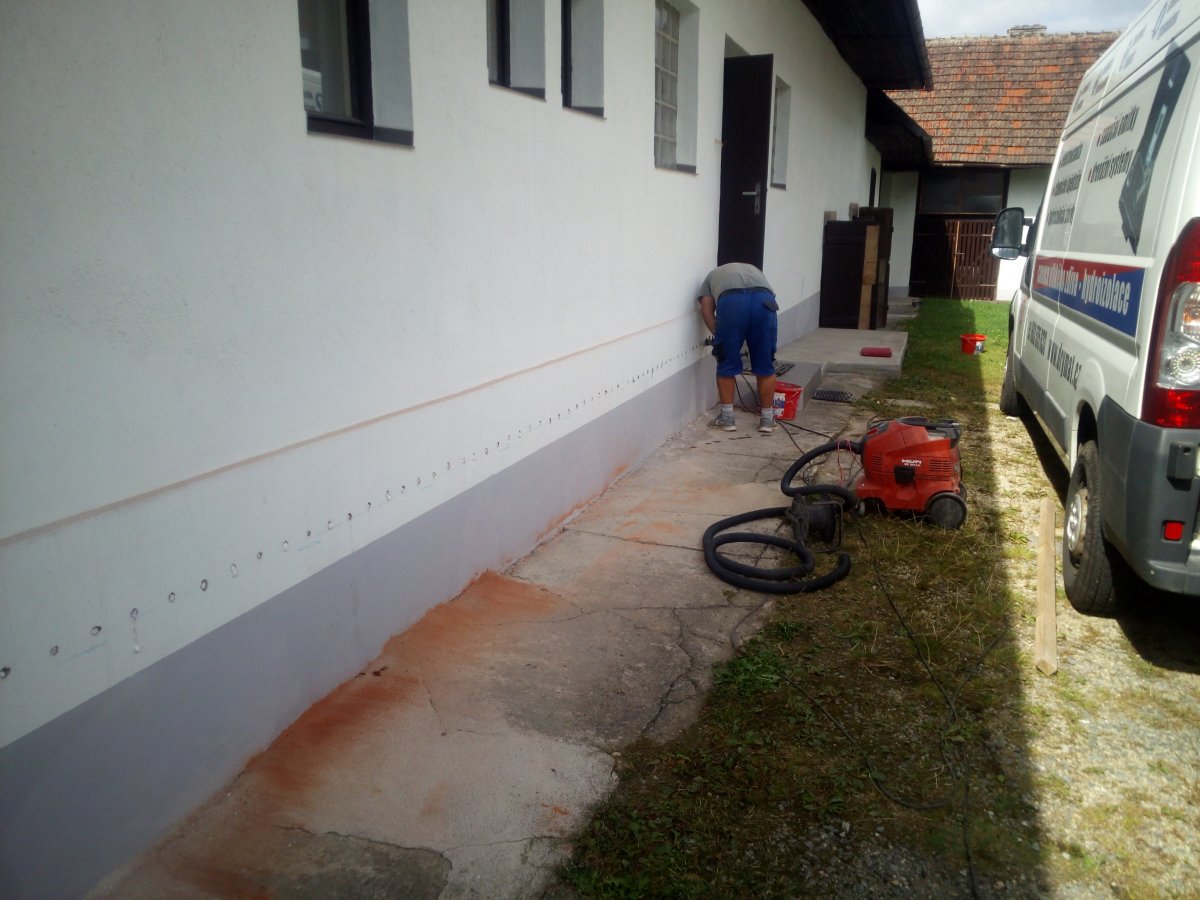 - Technologie: Obvodové zdivo rodinného domu mělo již dožilé hydroizolace, a proto bylo třeba je opětovně doplnit. Bylo použito injektážních clon proti vzlínající zemní vlhkosti s překrytím injektážní linie pásem hydroizolační stěrky.