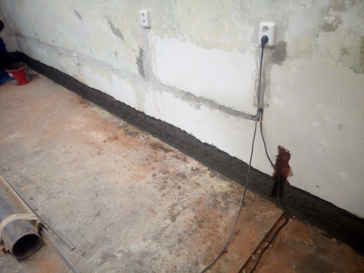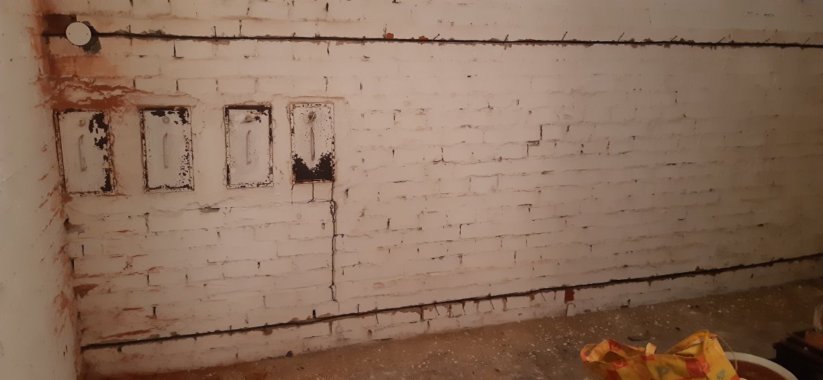 - Technologie: Pro odvlhčení spodní stavby domu byla využita zejména technologie pulsní drátové elektroosmózy, která je schopna potlačit vzlínající vlhkost z podzákladí objektu a částečně i vlhkost pronikající do zdiva z boku od přilehlé zeminy.