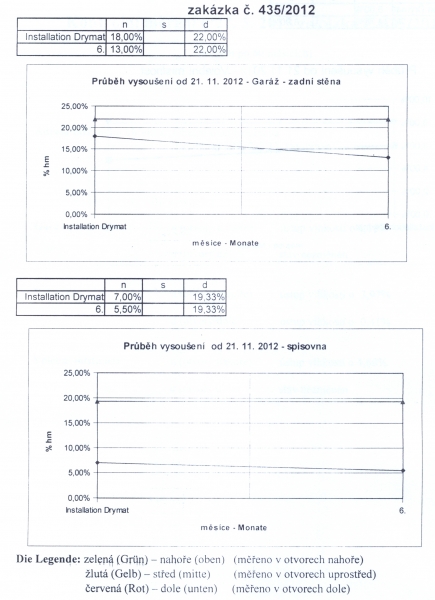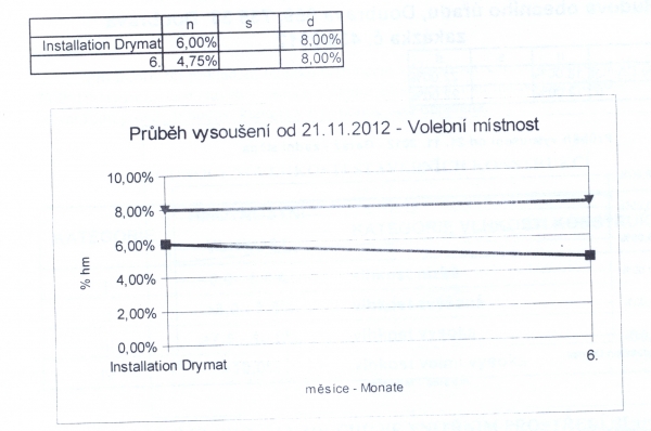 - Technologie: Umístění druhé výkonnější jednotky bezdrátové elektroosmózy v tomto objektu pro pokrytí druhého křídla budovy. Instalována jednotka s dosahem až 15 metrů v poloměru. Vlhkost snížena na možnost aplikace sanačních omítek.